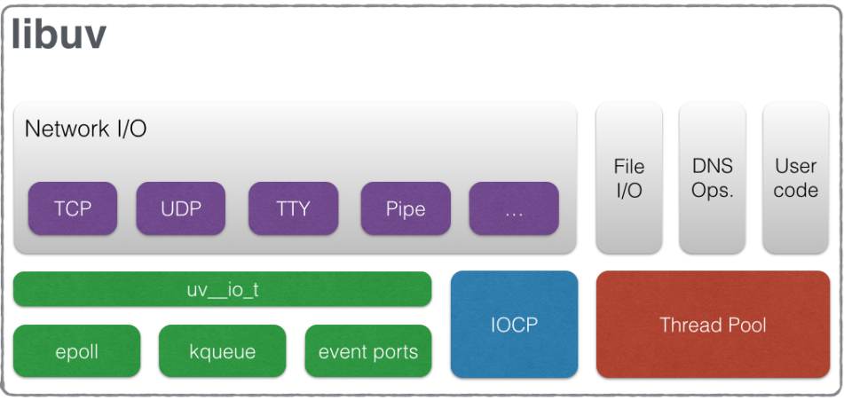 nodejs를 구성하는 여러 라이브러리 중 하나입니다. javascript를 사용하는 node 특성 상 어쩔 수 없이 싱글 스레드 기반인데, 비동기 I/O를 처리하기 위해서 libuv를 채택하여 사용하고 있습니다. (libuv of nodejs official repository)
